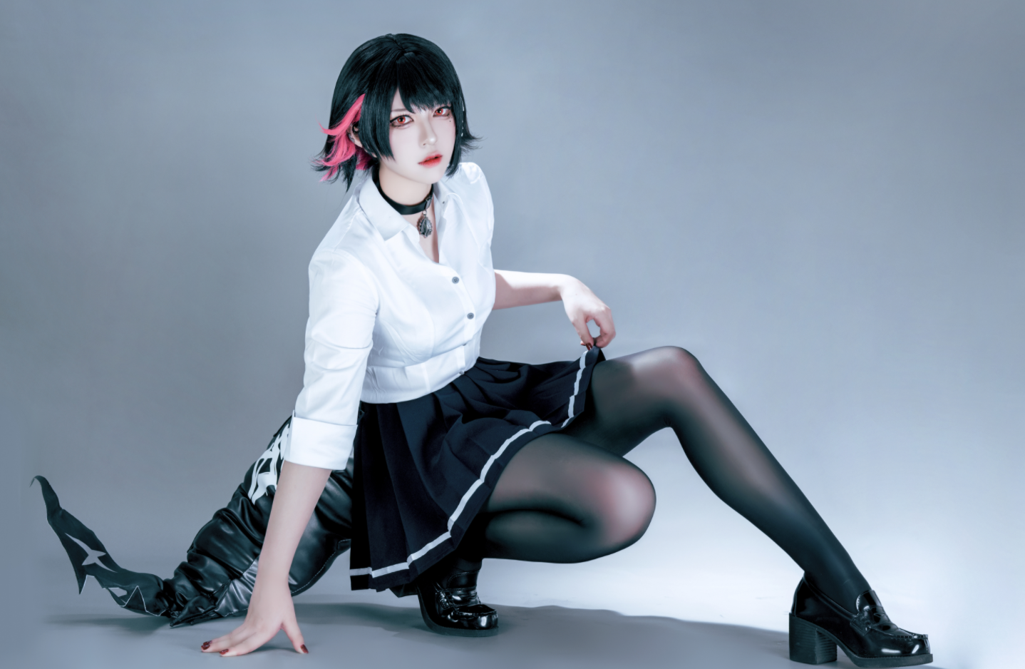 艾莲·乔在游戏里的标志性元素有很多。白色的长发,黑色的制服,还有那双yong远平静的眼睛。Coser半半子把这些细节都照顾到了。而且她做得zui好的地方在于,她没有过度地去”演”。有些coser为了还原角色会把表情做得特别夸张,用力过猛。但Coser半半子没有。她就是安安静静地摆出姿势,让摄影师按快门。