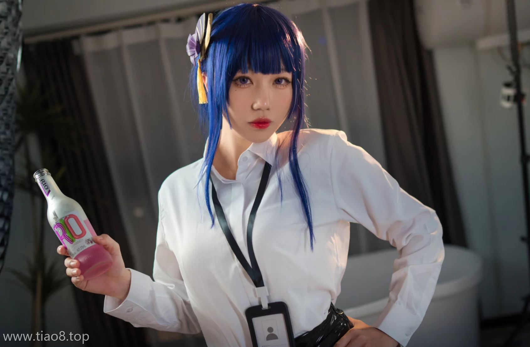 再来说主题,OL 雷电将军。这主题不好做,雷电将军本身有威严感,OL 风又得有职场的利落,俩放一块,稍不注意就会显得别扭。但无影喵喵没犯这错。她穿的 OL 西装没选亮面材质,是哑光的深紫色,灯光打上去不刺眼,却能显出面料的质感;内搭的白衬衫领口没系得死死的,解开了最上面一颗扣子,多了点松弛感,不像是硬套的 “职场人”,倒像是真的在办公室里待着的雷电将军。